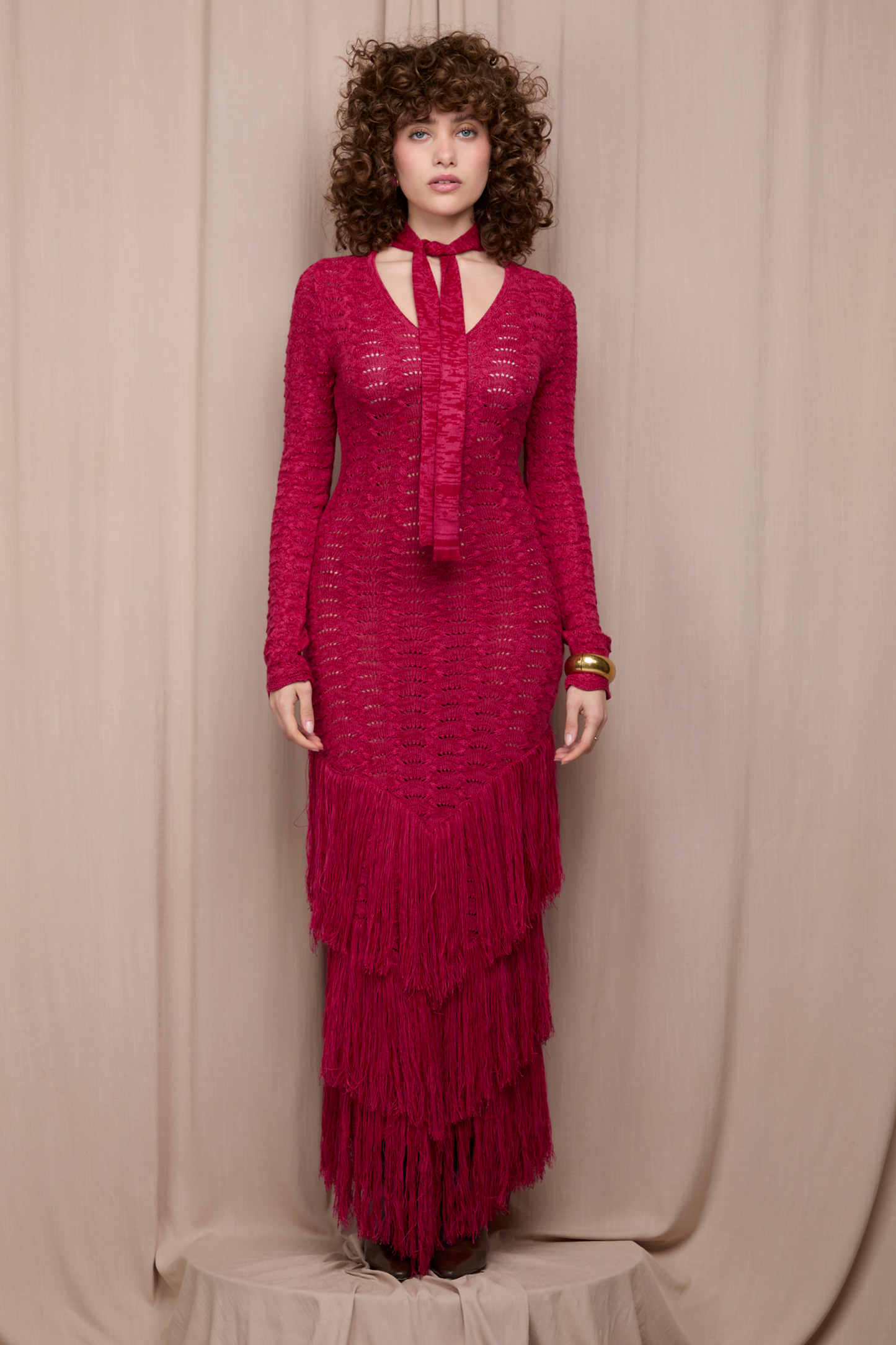 The dress you didn't know you needed! Rumi Red is a woven maxi dress with long sleeves, a versatile neckline, and tie-up straps. Its skirt features three layers of fringe that create a unique effect as it moves. Produced in a sustainable factory and handmade by Peruvian artisans.